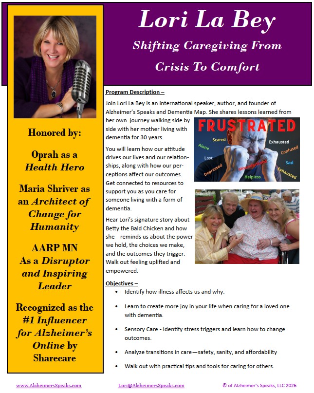 Below you can read or download a short biography on Lori La Bey which will detail her extensive personal and professional experience that makes her extremely unique in the industry. She is a treasure chest of uncommon knowledge which she freely shares connecting people to resources, products, and tools to live graciously along side all forms of dementia.