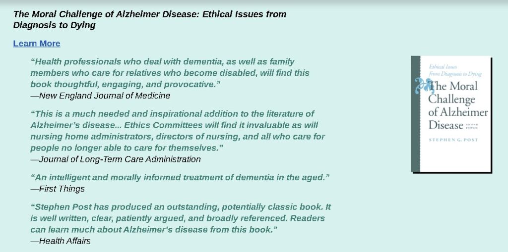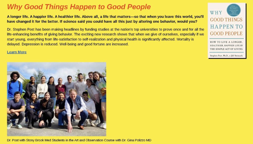 Stephen G. Post is the Director of the Center for Medical Humanities, Compassionate Care & Bioethics at Stony Brook University, which is ranked #7 in the 2025 Best Bioethics/Medical Ethics Master’s Degree Programs in the U.S.   www.stonybrook.edu/bioethics