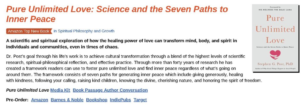 “What an engaging and inspiring read! Building on his earlier writing on the many forms that love can take, Dr. Post presents readers with seven pathways toward pure unlimited love. Each pathway is a mantra, one designed not only to help readers tap into this universal energy of love, but also to radiate this love outward toward others. In this exciting and creative book, Dr. Post skillfully weaves decades of research with dozens of personal stories, along with well-grounded, practical suggestions. A triumph!”